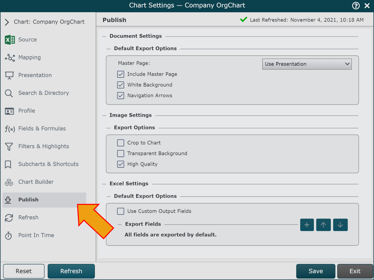 The Publish panel allows Administrators to configure default publishing settings, when exporting documents, images, and excel data from OrgChart.