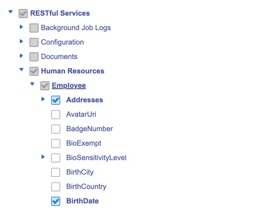 It is important to check the child boxes within parent boxes, otherwise data might not be selected that you had meant to select. For instance, check the values within the workAssignments table for the Job, Department, and Location tables. Ensure access is given to ShortName, LongName, if possible.