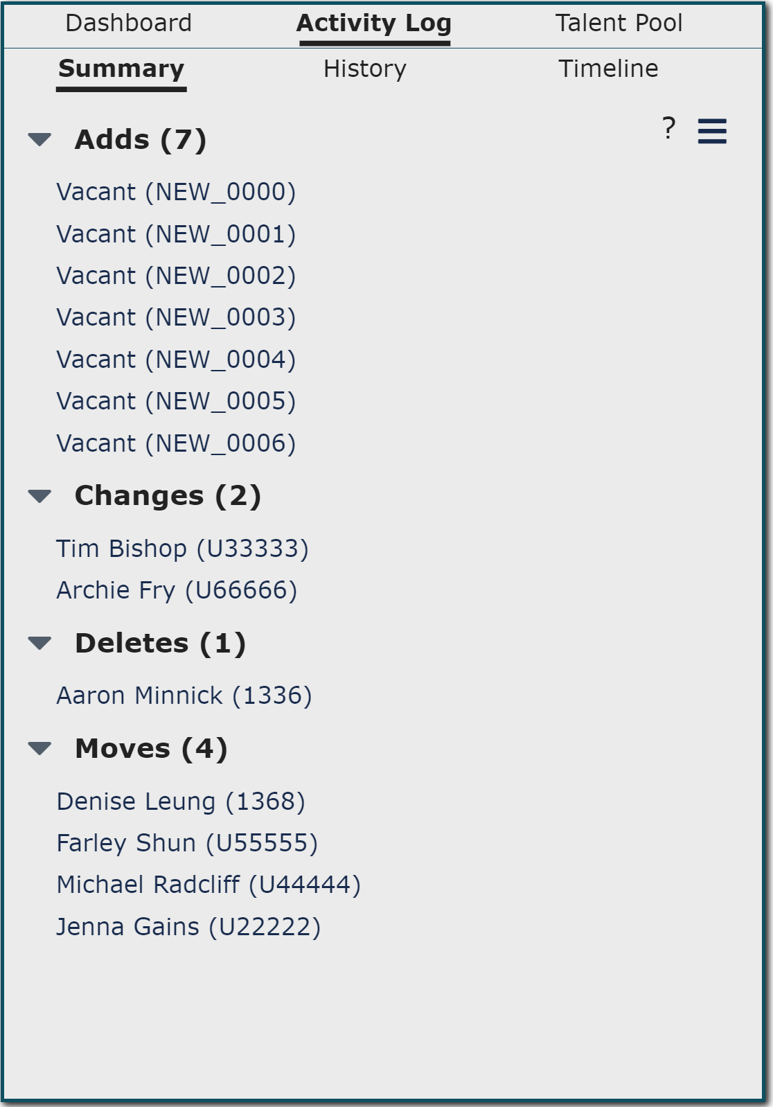 The Summary Mode groups changes by type (Add, Change, Comment, Delete, Move). Clicking on an update shows additional information about the update (at the bottom, in the Details panel) and navigates to the associated change in the org chart.