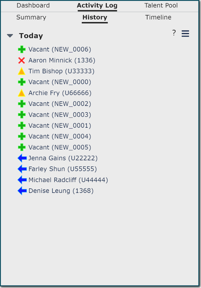 The History Mode groups changes based on when the changes were made. Clicking on an update shows additional details about the update (at the bottom in the Details panel) and navigates to the associated change in the org chart.
