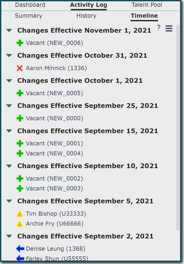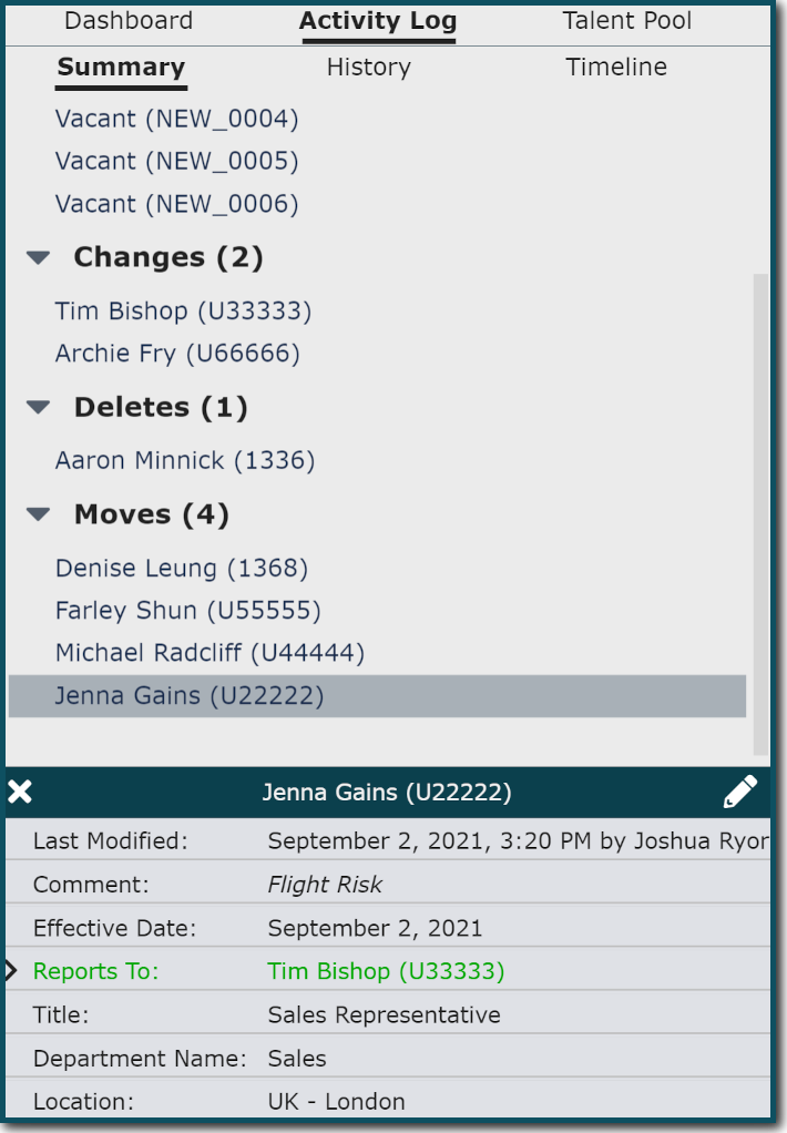 The Timeline Mode groups changes based on effective date. Clicking on an update shows additional details about the update (at the bottom in the Details panel) and navigates to the associated change in the org chart.