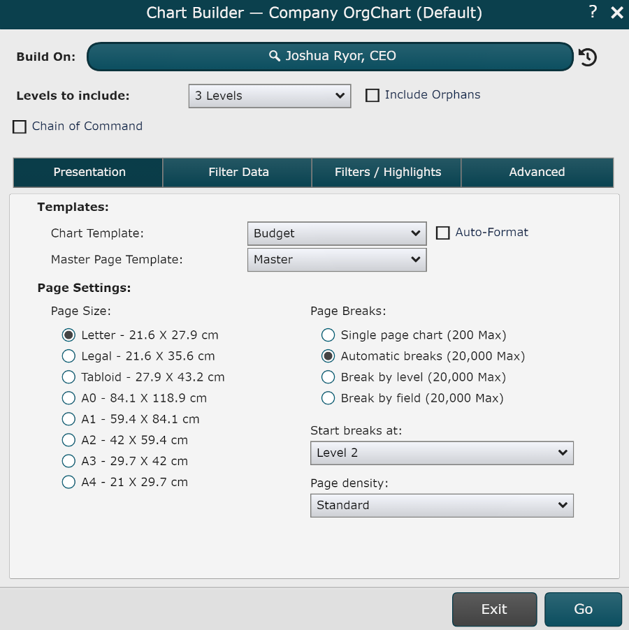 Automatic Breaks | Let OrgChart determine the optimal page breaking for your chart. You can choose to set the page density (Standard, Dense, or Very Dense), which will determine how many boxes should be on each page before inserting a page break. |