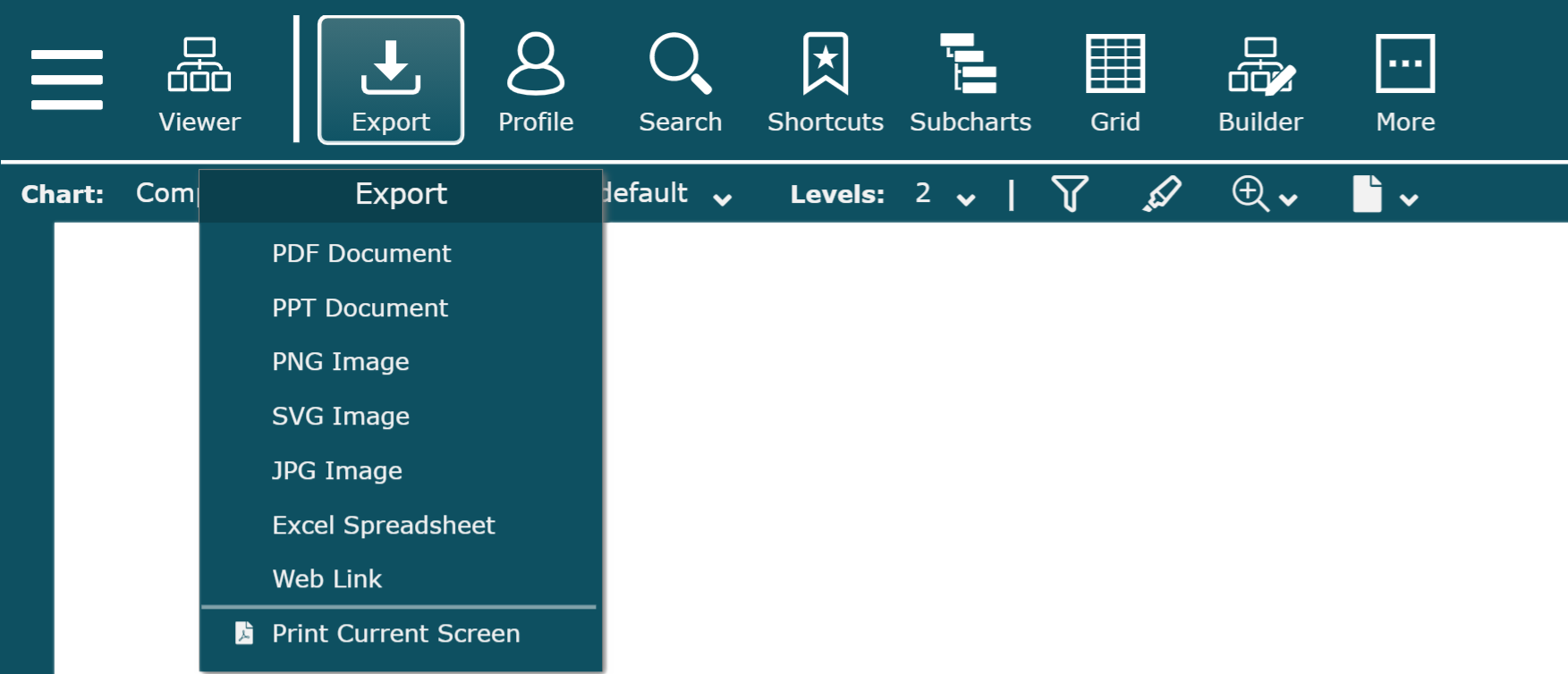 Click on the Export icon in the Top Toolbar. The Export Menu is displayed.