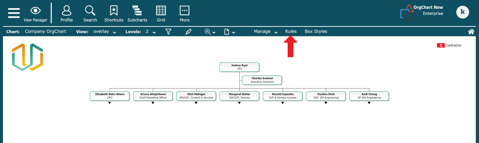 Views are comprised of Rules, which drive the presentation of your OrgChart. Use the View Dropdown to switch between the Views that you want to edit.