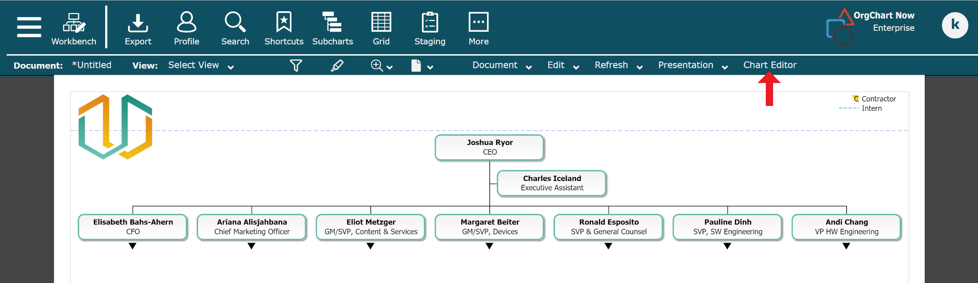 OrgChart allows Administrators and Read/Write users to customize Chart Documents using the Chart Editor in Workbench.